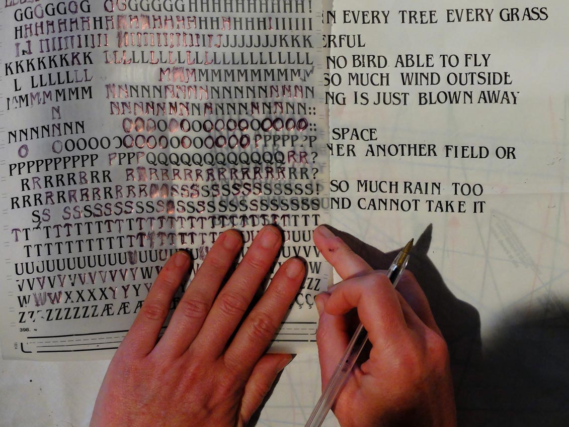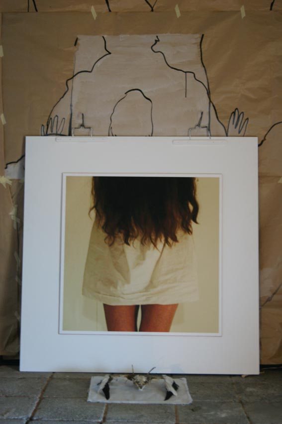 Een skelet getekend met wol, een lichaamskaart, een verzameling afgeknipt haar.